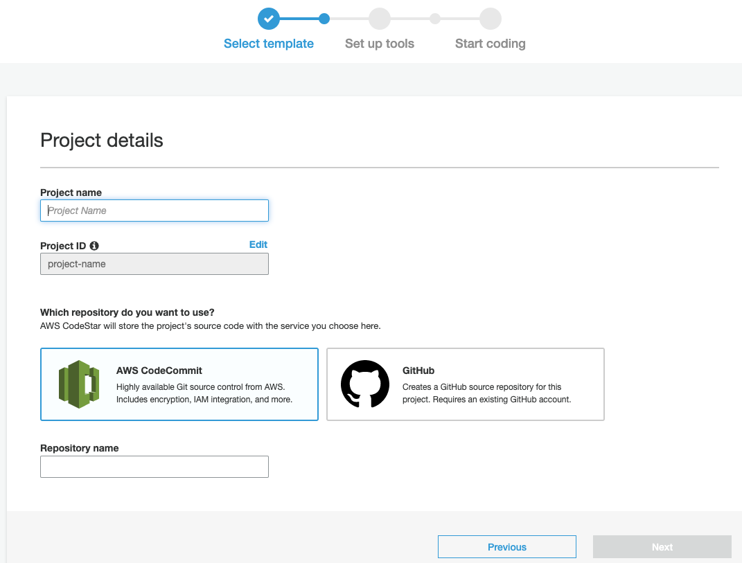 3. 프로젝트명을 입력하고 저장소는 AWS CodeCommit으로 한다.(Github 사용시 Github 선택)