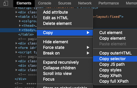 #contents > table > tbody앞서 가져온 selector를 이용해 아래와 같이 사용하면
