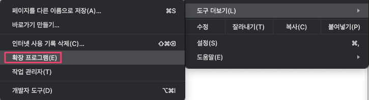 이제 크롬 브라우저를 열어 옵션 > 도구 더보기 >확장프로그램 탭으로 이동한다.