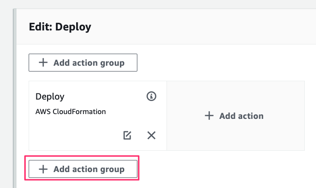 staging 파이프라인 편집을 들어가 Deploy 스테이지 편집 > 액션 그룹 추가를 누른다.