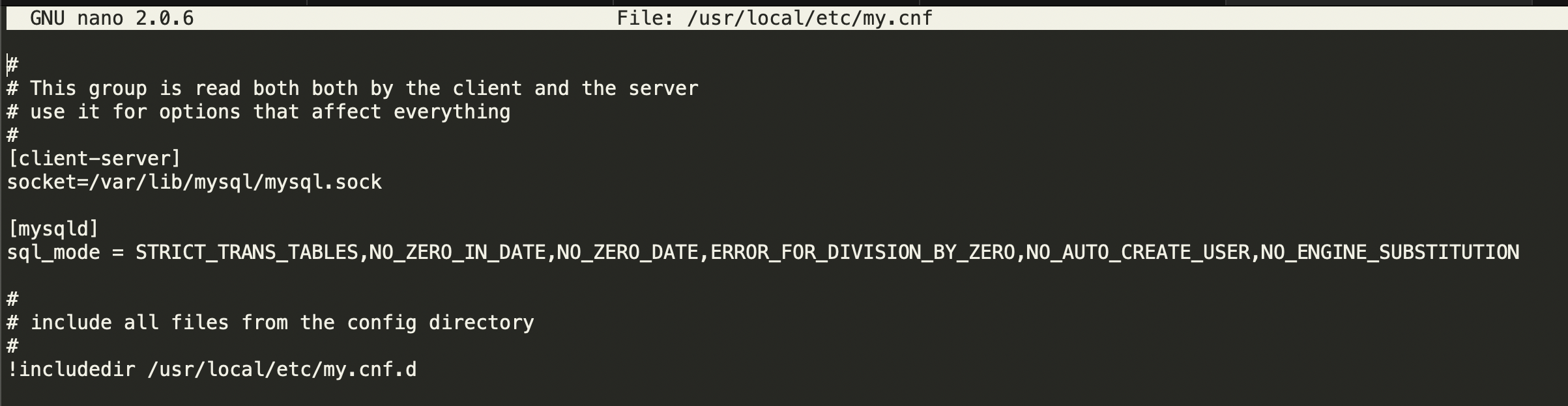 $ nano /etc/my.cnf ... [mysqld] sql_mode=STRICT_TRANS_TABLES,NO_ZERO_IN_DATE,NO_ZERO_DATE,ERROR_FOR_DIVISION_BY_ZERO,NO_AUTO_CREATE_USER,NO_ENGINE_SUBSTITUTION ... ...