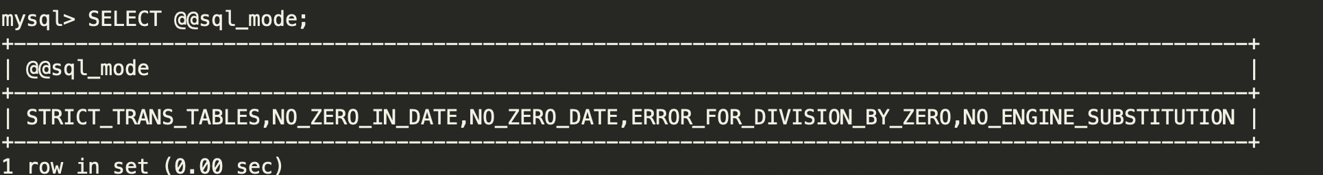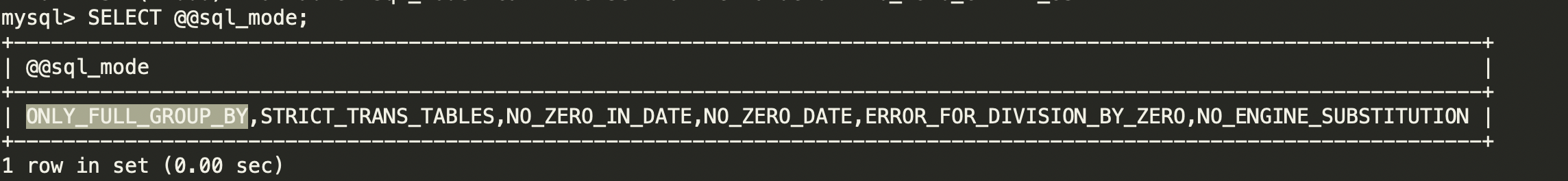mysql> SET SESSTION sql_mode='STRICT_TRANS_TABLES,NO_ZERO_IN_DATE,NO_ZERO_DATE,ERROR_FOR_DIVISION_BY_ZERO,NO_ENGINE_SUBSTITUTION'; mysql> SET GLOBAL sql_mode='STRICT_TRANS_TABLES,NO_ZERO_IN_DATE,NO_ZERO_DATE,ERROR_FOR_DIVISION_BY_ZERO,NO_ENGINE_SUBSTITUTION';다시 확인해보면 사라져있다.