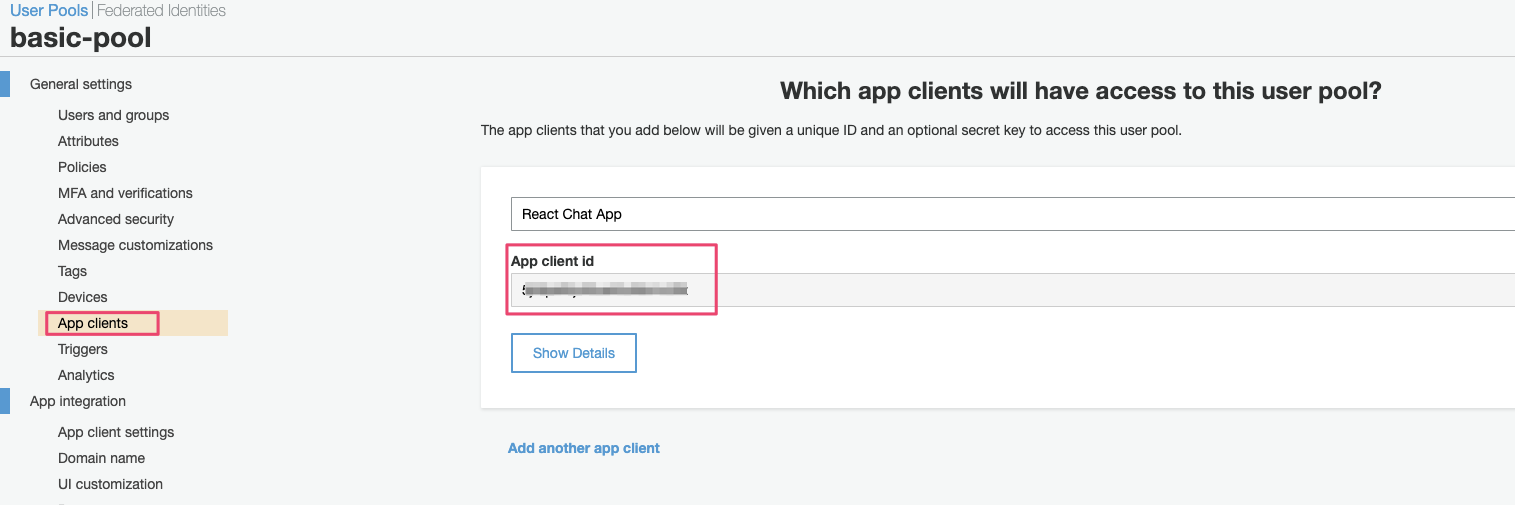 App clients 카테고리에 들어가면 App Client id를 확인 할 수 있다.