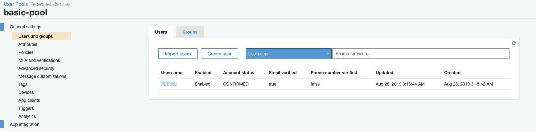 User pool > Users and groups에 들어가면 계정이 추가가 되어있다.