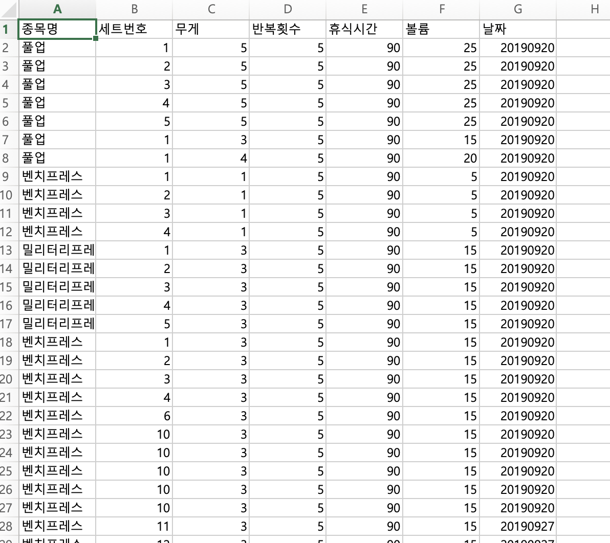 let rows = [ ["종목명", "세트번호", "무게", "반복횟수", "휴식시간", "볼륨", "날짜"] ]; let csvContent = "\uFEFF"; // 한글 깨짐 방지 // sql 결과값을 배열값으로 rows에 푸시 async insertCsvRows(rows, records) { try { await records.forEach(function(record) { const arrayOne = [`${record.종목명}`,`${record.세트번호}`,`${record.무게}`,`${record.반복횟수}`,`${record.휴식시간}`,`${record.볼륨}`,`${record.날짜}`] rows.push(arrayOne); }); return rows; } catch(e) { ... } } // csv 컨텐츠 생성 async makeCsvContent(rows, csvContent) { try { await rows.forEach(function(rowArray) { let row = rowArray.join(","); csvContent += row + "\r\n"; }); return csvContent; } catch(e) { ... } } // csv 파일 생성 async makeCsvFile(csvContent) { try { const tempname = "파일명"; const fileUri = await FileSystem.documentDirectory + tempname + ".csv"; await FileSystem.writeAsStringAsync(fileUri, csvContent, {encoding: `FileSystem.EncodingType.UTF8`}); return fileUri; } catch(e) { ... } } rows = await this.insertCsvRows(rows, _array); // _array는 sqlite에서 select한 결과값들 csvContent = await this.makeCsvContent(rows, csvContent) const uri = await this.makeCsvFile(csvContent);메일로 전송한 파일을 열어보면 아래와 같다.