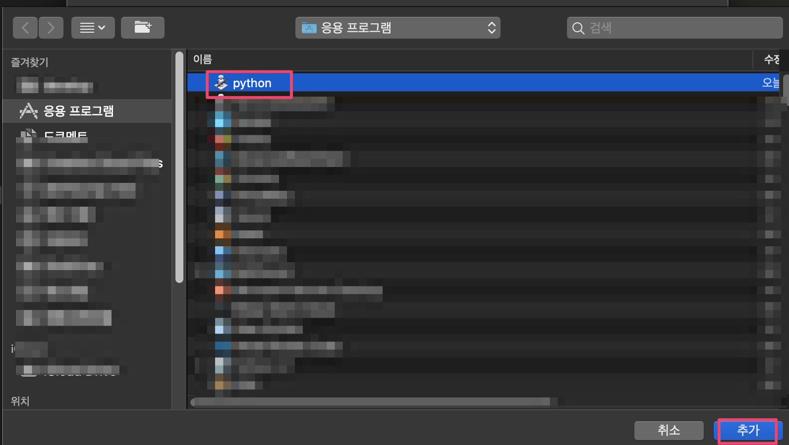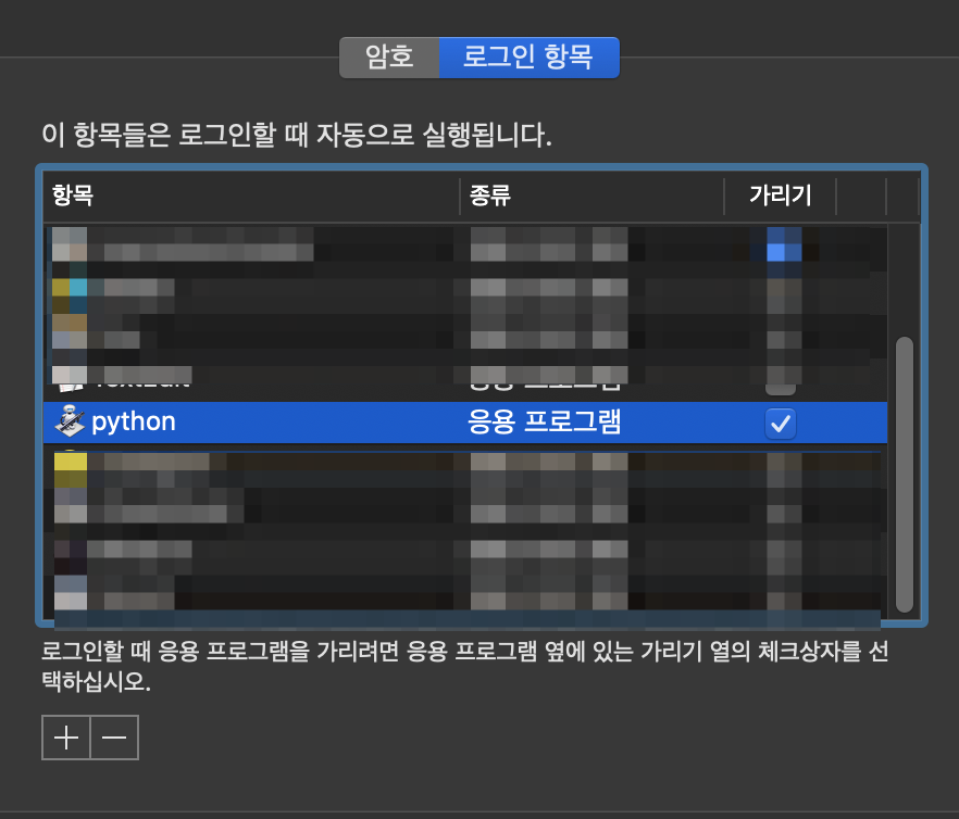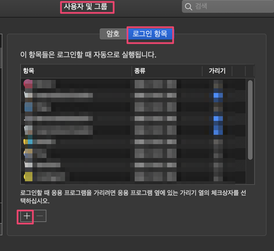 [시스템 환경설정] > [사용자 및 그룹] > [로그인 항목] > [+]