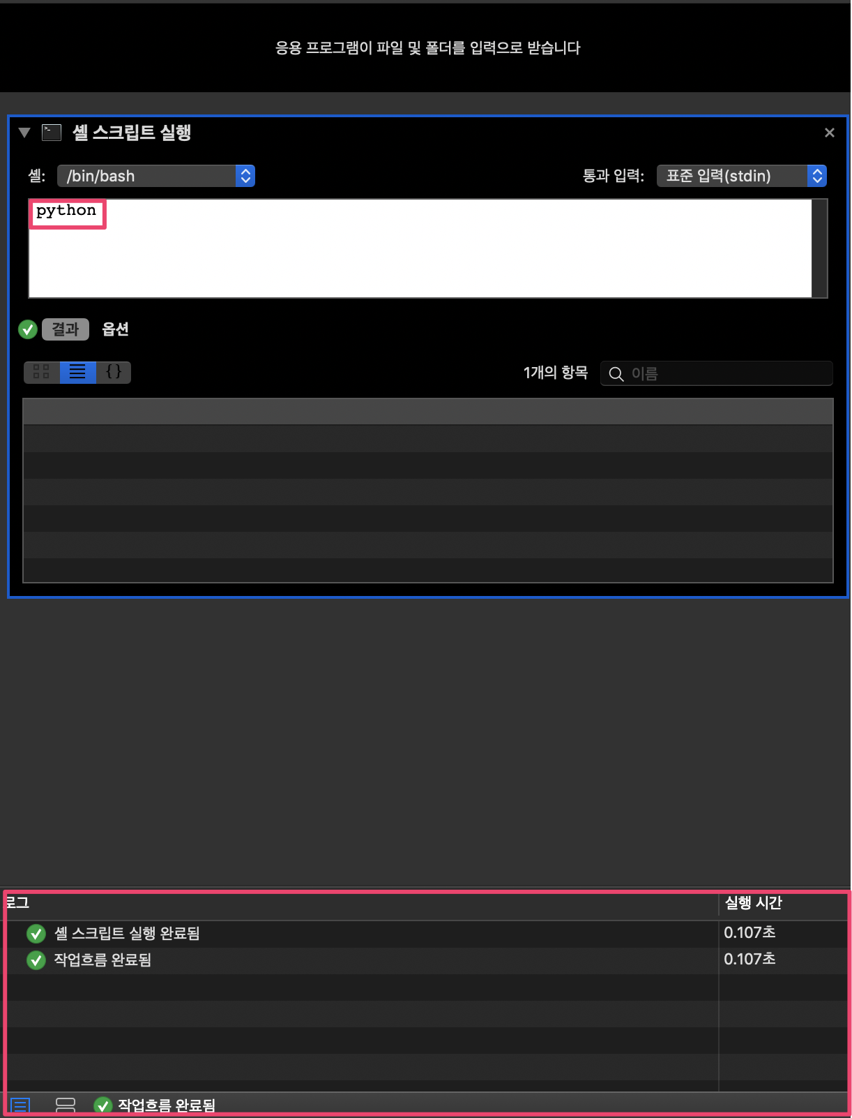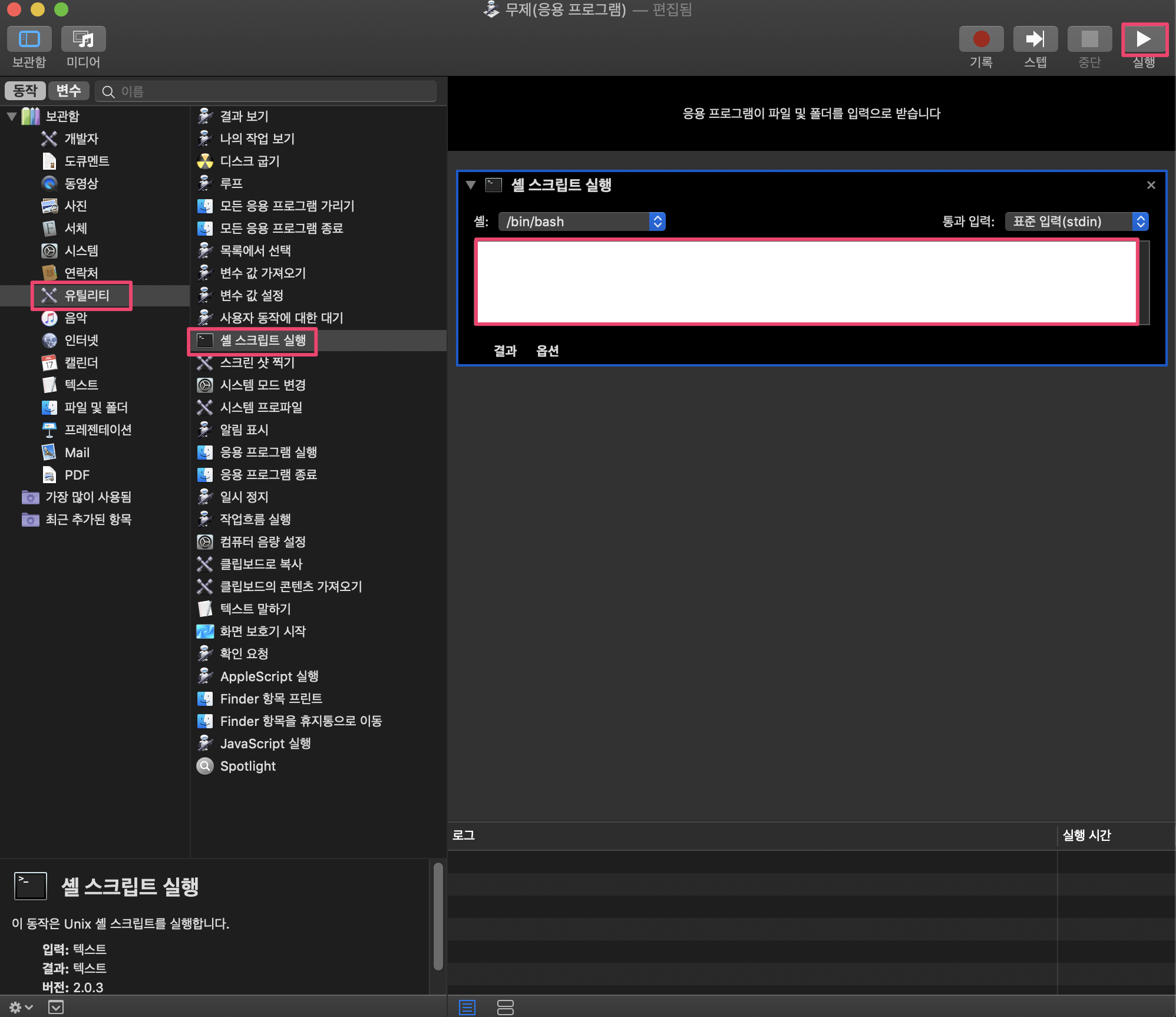 [보관함] > [유틸리티] > [쉘 스크립트 실행] 선택