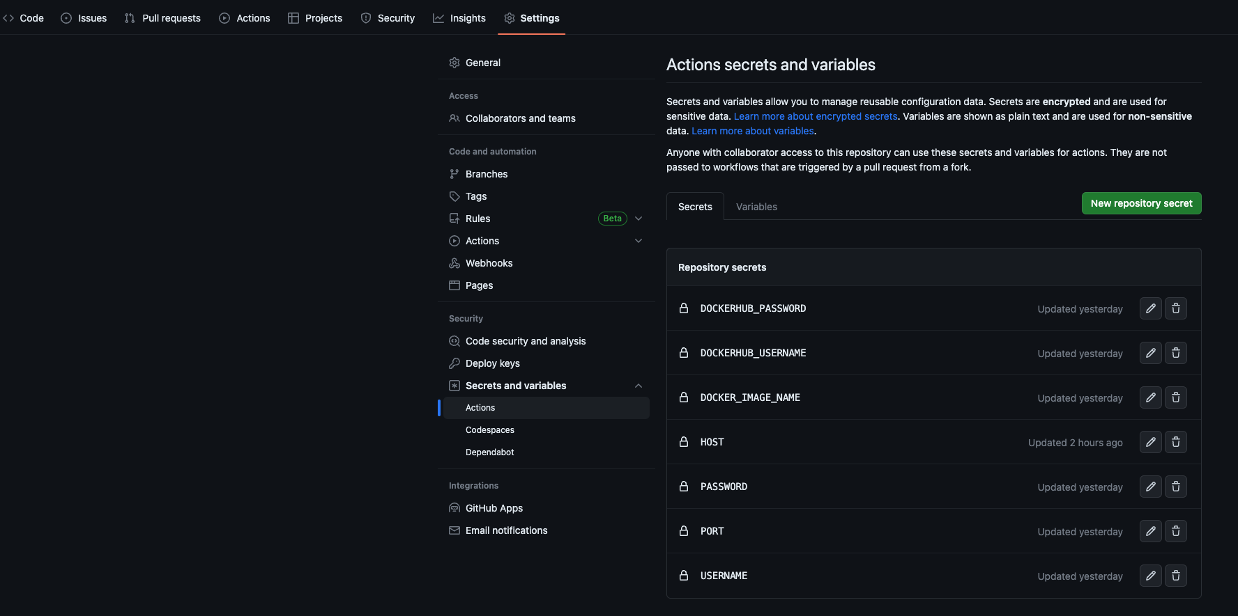 name: cicd on: push: branches: [main] jobs: build: runs-on: ubuntu-latest strategy: matrix: node-version: [18.12.1] steps: - name: Checkout uses: actions/checkout@v2 - name: Set up Docker Buildx uses: docker/setup-buildx-action@v1 - name: Login to DockerHub uses: docker/login-action@v1 with: username: ${{ secrets.DOCKERHUB_USERNAME }} password: ${{ secrets.DOCKERHUB_PASSWORD }} - name: Build and push uses: docker/build-push-action@v2 with: context: . file: ./Dockerfile push: true tags: ${{ secrets.DOCKERHUB_USERNAME }}/${{ secrets.DOCKER_IMAGE_NAME }}:latest push-args: --disable-content-trust deploy: needs: build runs-on: ubuntu-latest steps: - name: ssh connect & production uses: appleboy/ssh-action@v0.1.10 with: host: ${{ secrets.HOST }} username: ${{ secrets.USERNAME }} password: ${{ secrets.PASSWORD }} port: ${{ secrets.PORT }} script: | cd server docker login --username ${{ secrets.DOCKERHUB_USERNAME }} --password ${{ secrets.DOCKERHUB_PASSWORD }} docker system prune -a --volumes -f docker compose pull -q docker compose up --force-recreate --build -d --quiet-pull 2>log.out cat log.out3. secrets 추가
