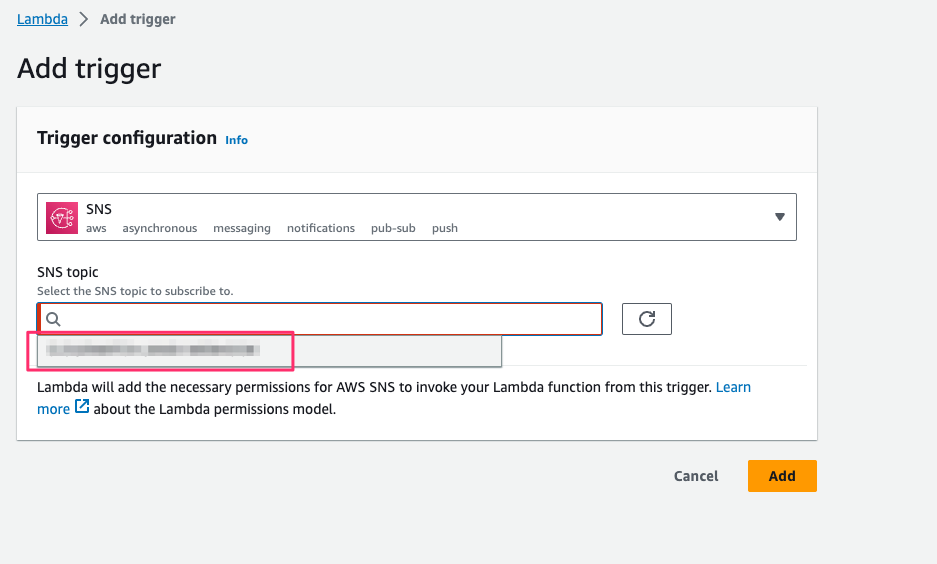 // index.mjs import axios from "axios"; export const handler = async (event) => { console.log(JSON.stringify(event)); const JANDI_ENDPOINT = '잔디에서 발급한 webhook URL 입력'; const msg = JSON.parse(event["Records"][0]["Sns"]["Message"]); let issue, issueOn; const NewStateReason = msg["NewStateReason"]; const Dimensions = msg["Trigger"]["Dimensions"]; const MetricName = msg["Trigger"]["MetricName"]; const Threshold = msg["Trigger"]["Threshold"]; const reason = /.*datapoint \[(.*)\].*/g.exec(NewStateReason)[1]; if (MetricName == "DatabaseConnections") { issue = "DB 연결 수 과도"; issueOn = `${Threshold} 초과 [ ${reason} ]`; } else if (MetricName == "FreeableMemory") { const mb = Threshold / 1000000; issue = "사용 가능한 메모리 공간 부족"; issueOn = `${mb} MB 보다 부족 [ ${reason} ]`; } else if (MetricName == "CPUUtilization") { issue = "CPU 사용량 과도"; issueOn = `CPU 사용량 ${Threshold} % 초과 [ ${reason} ]`; } else if (MetricName == "disk_used_percent") { issue = "디스크 용량이 가득 참"; issueOn = `디스크 용량 ${Threshold} % 초과 [ ${reason} ]`; } else { issue = MetricName; issueOn = `${Threshold} 초과`; } const InstanceId = Dimensions.filter( (Dimension) => Dimension.name == "InstanceId" )[0]; const DBInstanceIdentifier = Dimensions.filter( (Dimension) => Dimension.name == "DBInstanceIdentifier" )[0]; let instanceId, rdsName; if (InstanceId) { instanceId = InstanceId.value; } if (DBInstanceIdentifier) { rdsName = DBInstanceIdentifier.value; } const name = rdsName ? rdsName : instanceId; const message = { "body" : "[AWS Infra Notification] TEST", "connectColor" : "#FAC11B", "connectInfo" : [{ "title" : "header", "description" : "[" + name + "] 인프라 위험 탐지!", }, { "title": "section", "description": "> *알림 |* " + name + " / " + issue + "\n> *기준 |* " + issueOn, // "imageUrl": "https://link" }] }; try { await axios.post(JANDI_ENDPOINT, message); return { status: 200, body: JSON.stringify( { message: "Successfully ended", input: event, }, null, 2 ), }; } catch (err) { return { statusCode: 500, body: "Error", }; } };그리고 Lambda에 trigger 설정을 한다.
