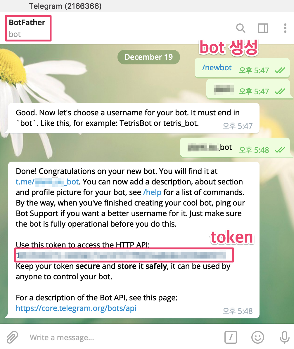 봇 생성 & 토큰값 얻기