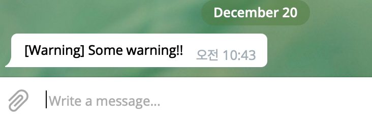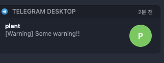 const wstlogger = require("winston"); const TelegramLogger = require("winston-telegram"); wstlogger.add(new TelegramLogger( { token: process.env.TELBOT_TOKEN, chatId: process.env.TELBOT_CHATID, level: "warn", unique: true, formatMessage: function (options: any) { let message = options.message; if (options.level === "warn") { message = "[Warning] " + message; } return message; } } )); wstlogger.warn("Some warning!!");실행