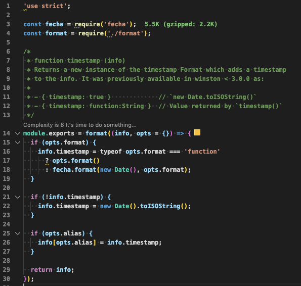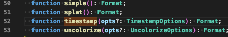 const timestamp = format((info: any, opts: any = {}) => { if (opts.format) { info.timestamp = typeof opts.format === "function" ? opts.format() : fecha.format(moment(), opts.format); } if (!info.timestamp) { info.timestamp = moment().format().replace(/T/, " ").replace(/\+.+/, ""); } if (opts.alias) { info[opts.alias] = info.timestamp; } return info; });결과 소스 코드